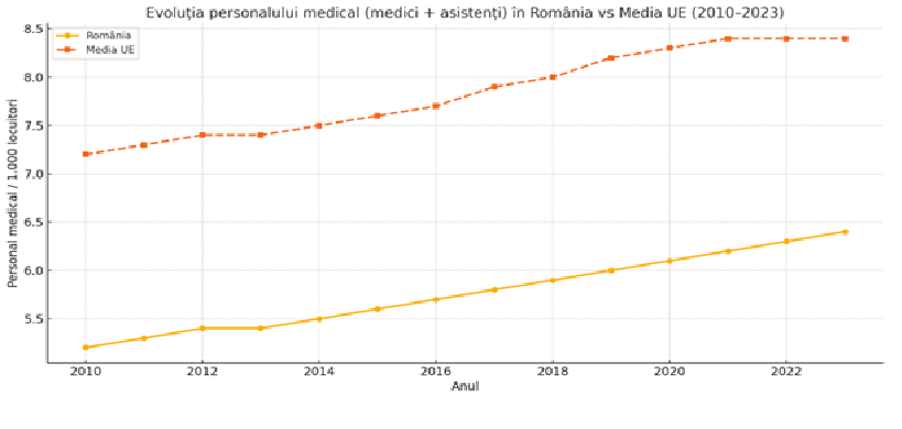 B. Evoluția personalului medical (medici și asistenți) în România vs media UE (2010 – 2023)